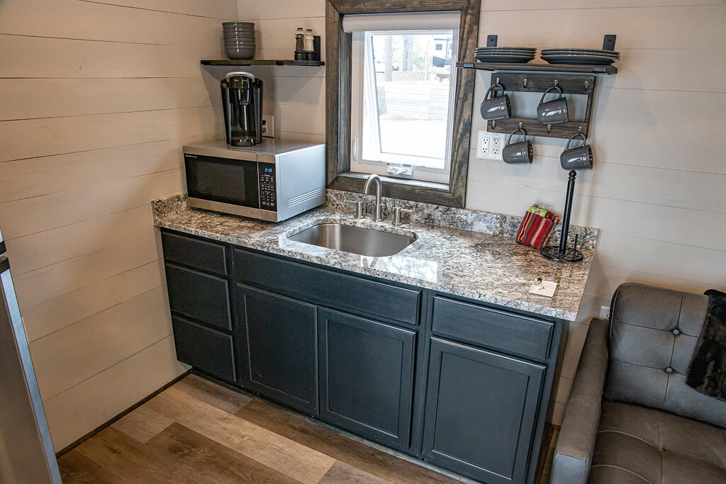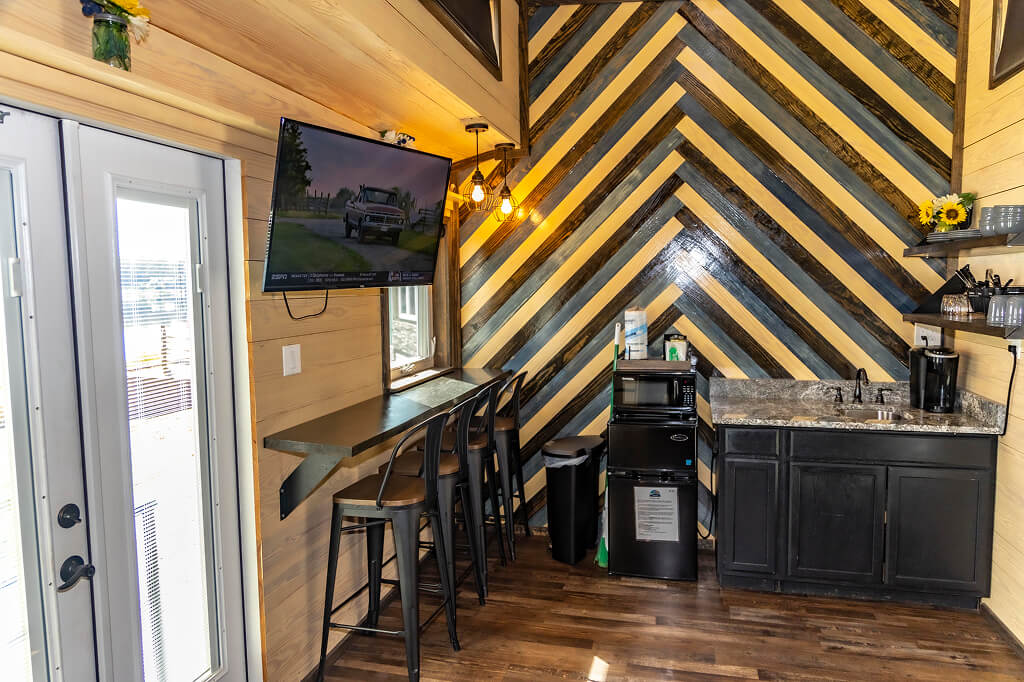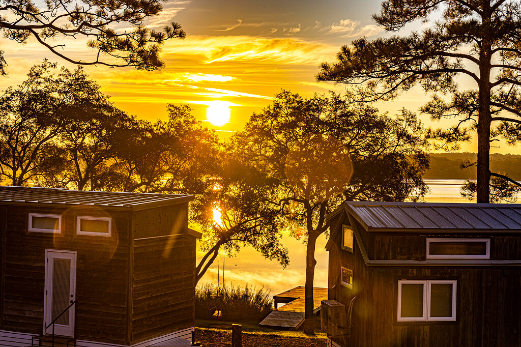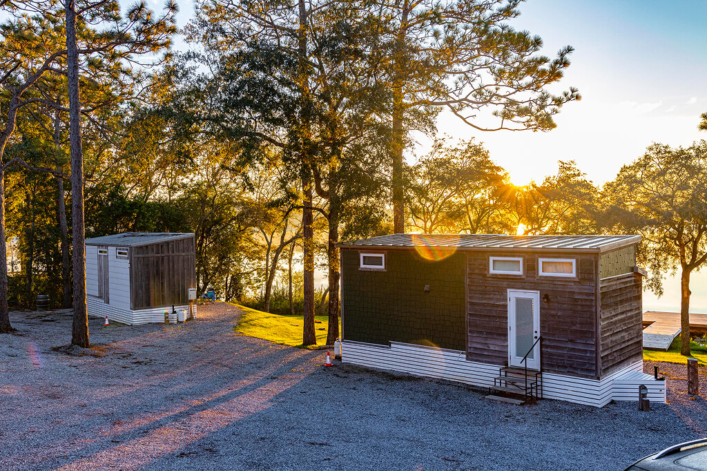 Charming tiny homes located along the Holley Lake shoreline, offering a cozy and modern retreat perfect for a peaceful getaway.